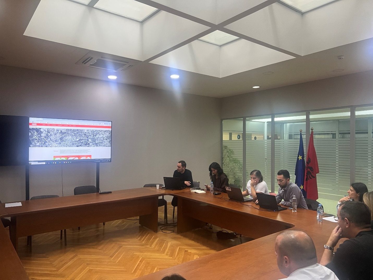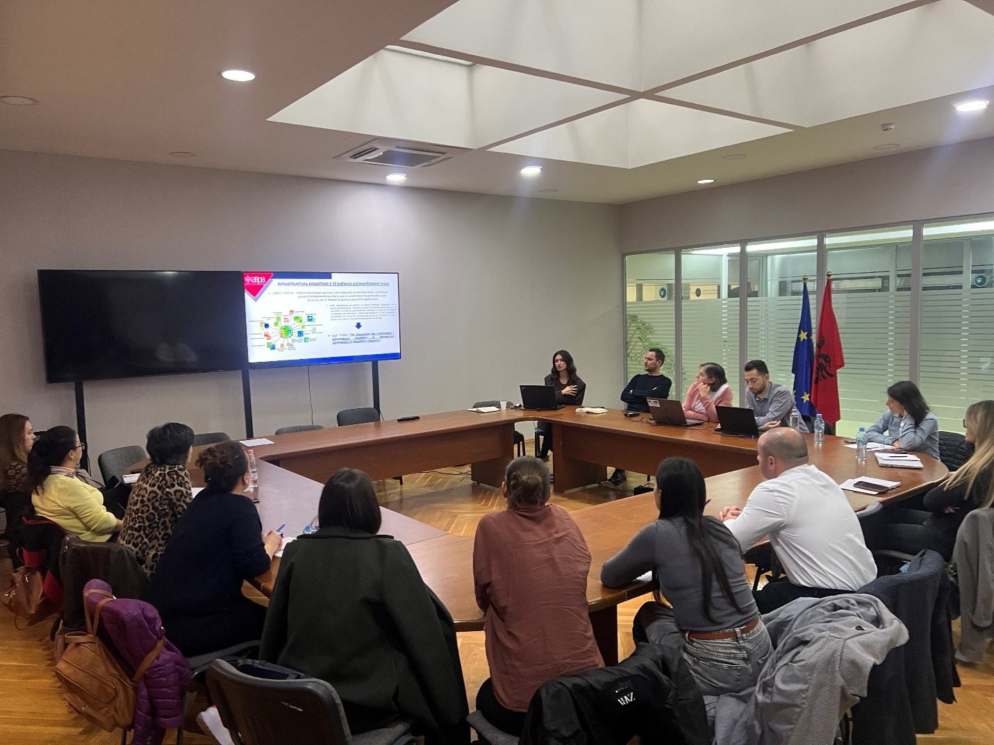 Trajnimi ishte i fokusuar në strukturën dhe funksionimin e infrastrukturës kombëtare të të dhënave gjeohapësinore (NSDI), rolin e saj në harmonizimin dhe shpërndarjen e të dhënave, si dhe përgjegjësitë institucionale në këtë proces. Gjatë këtij sesioni u demonstruan në mënyrë praktike funksionalitetet kryesore të Gjeoportalit Kombëtar, duke përfshirë kërkimin, vizualizimin, përdorimin dhe shkarkimin e të dhënave gjeohapësinore, si dhe mënyrat e standardizimit të të dhënave për publikim, vizualizim dhe menaxhim përmes përdorimit të shërbimeve të rrjetit. Pjesëmarrësit u njohën me rëndësinë e strukturimit të saktë të metadatave, si dhe rolin që NSDI luan në rritjen e cilësisë, interoperabilitetit dhe aksesueshmërisë së të dhënave gjeohapësinore në nivel kombëtar.